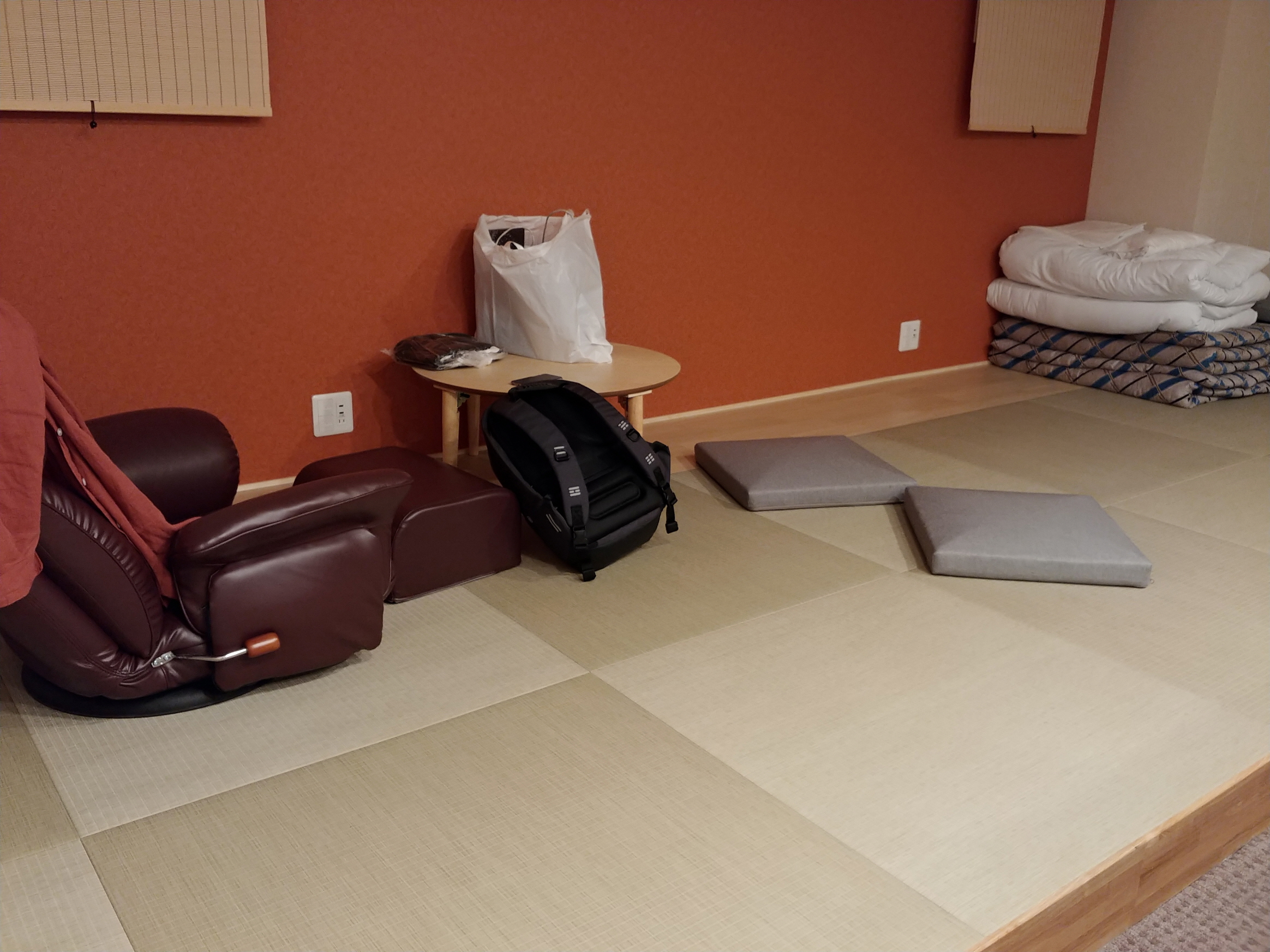 거실에 여러명이 앉을 수 있는 쇼파가 있고 그 옆에 다다미가 깔려있는곳에서 요이불 깔고 주무시면됩니다.