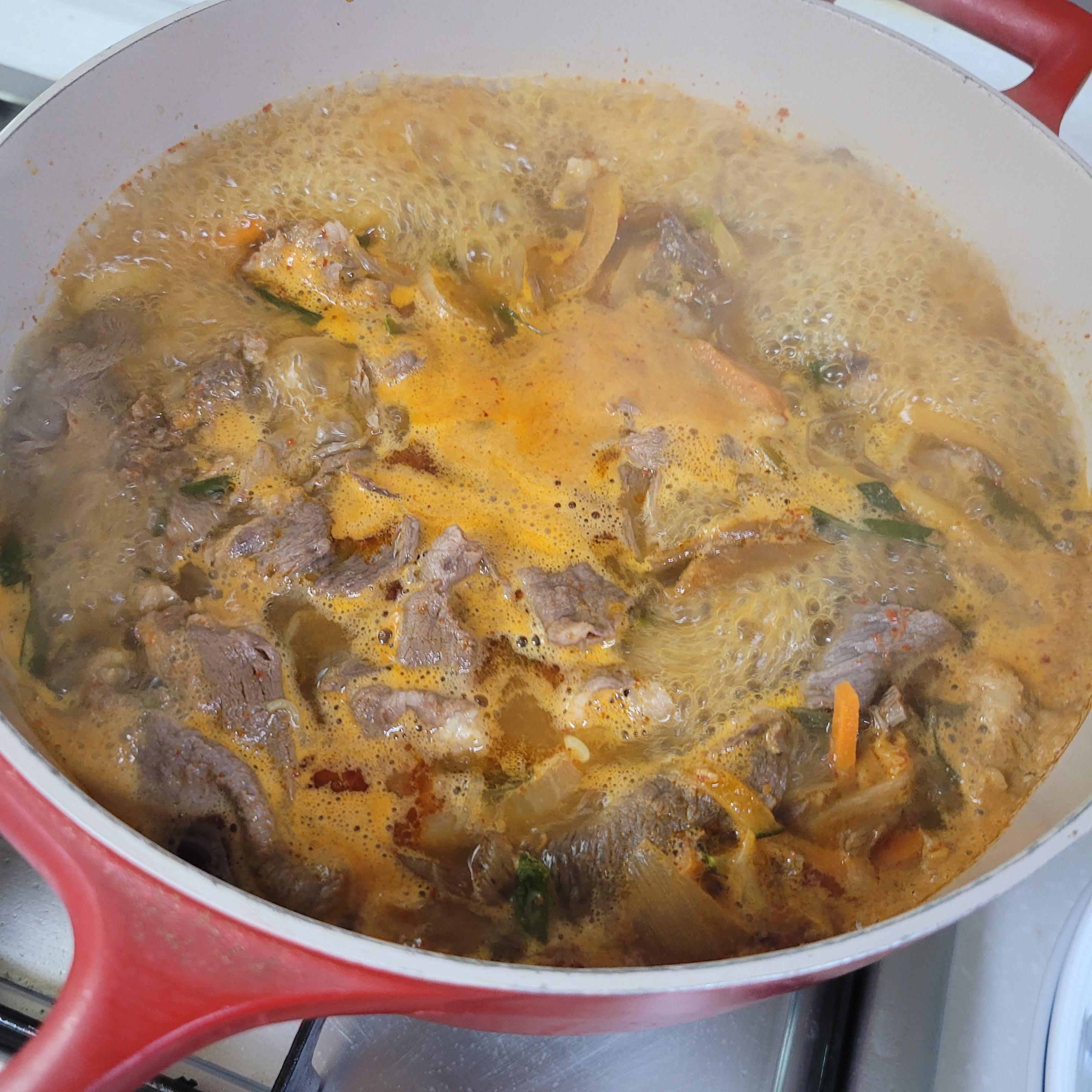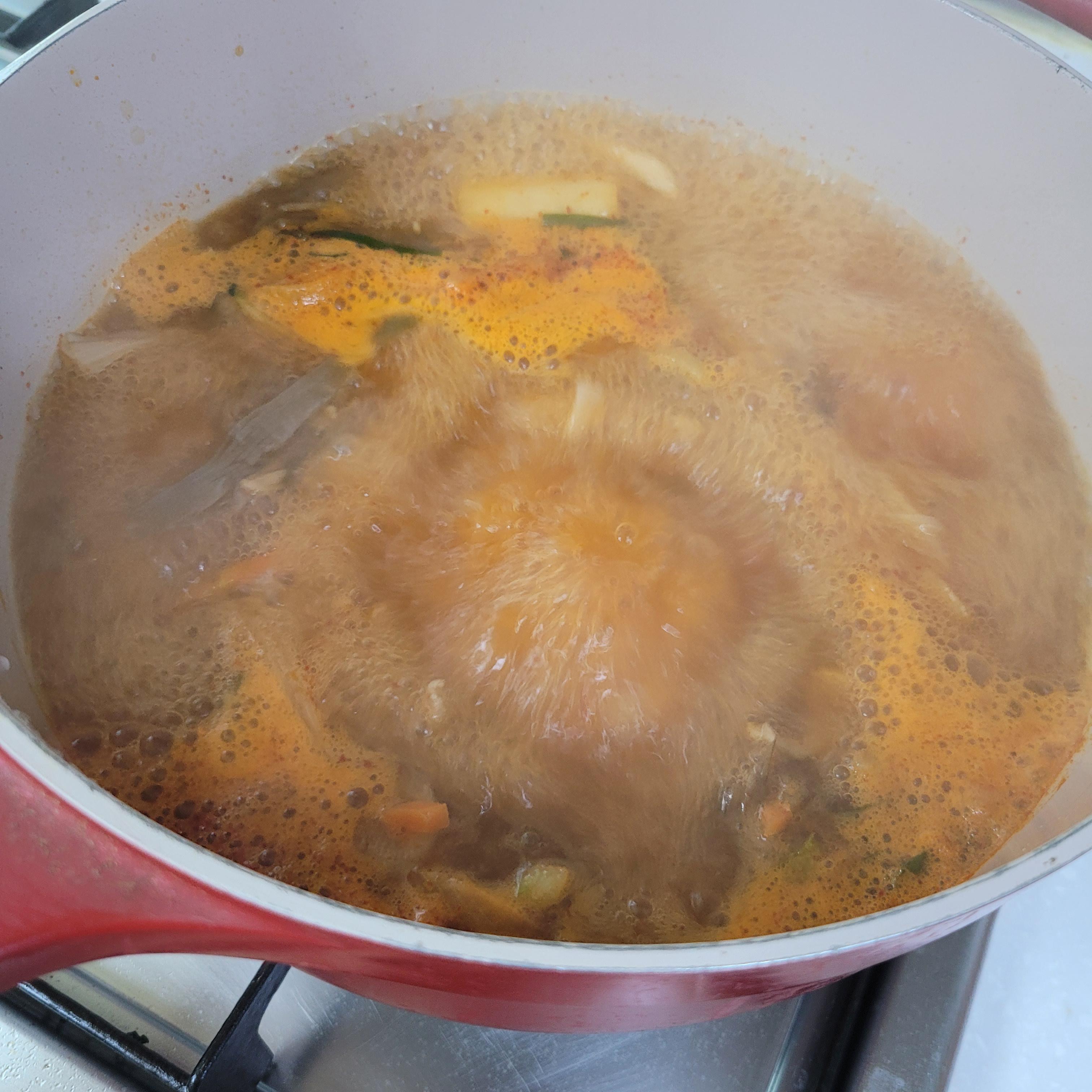 끓으면 샤브샤브용 고기, 참치액젓, 고춧가루를 넣고 끓여주세요. 취향껏 더 매콤한걸 좋아하시는분들은 고춧가루를 더 추가하셔도 좋아요.