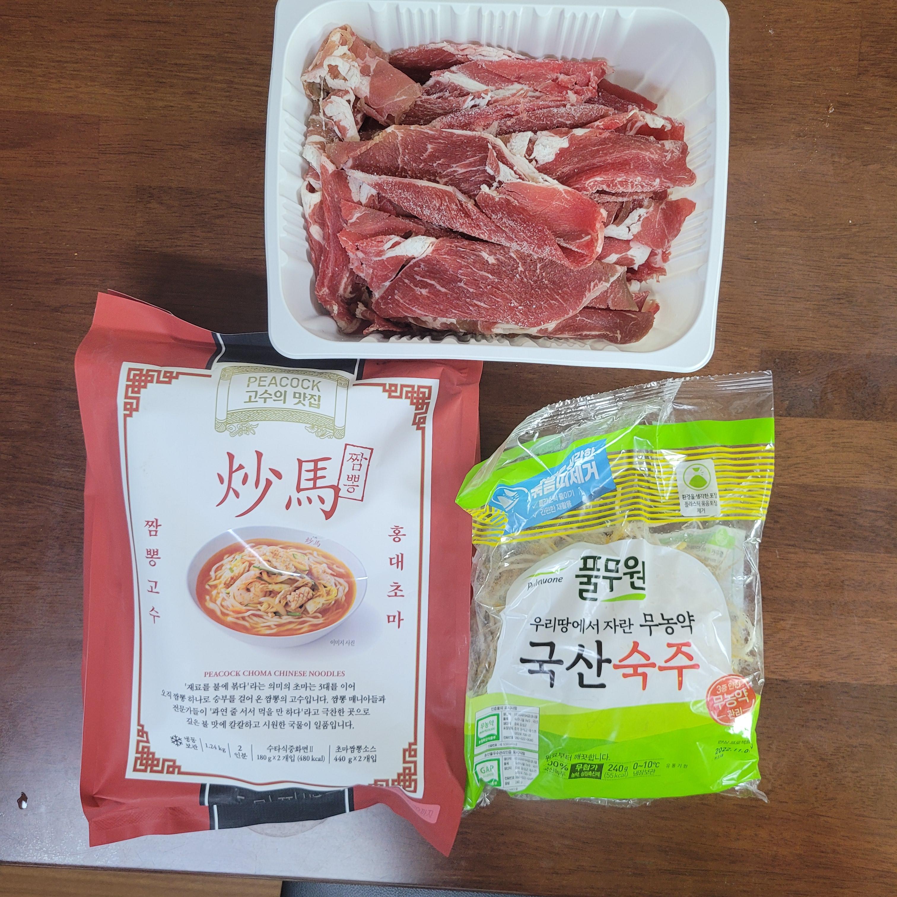 재료는 짬뽕밀키트 4인분, 샤브샤브고기 500g, 숙주나물 240g