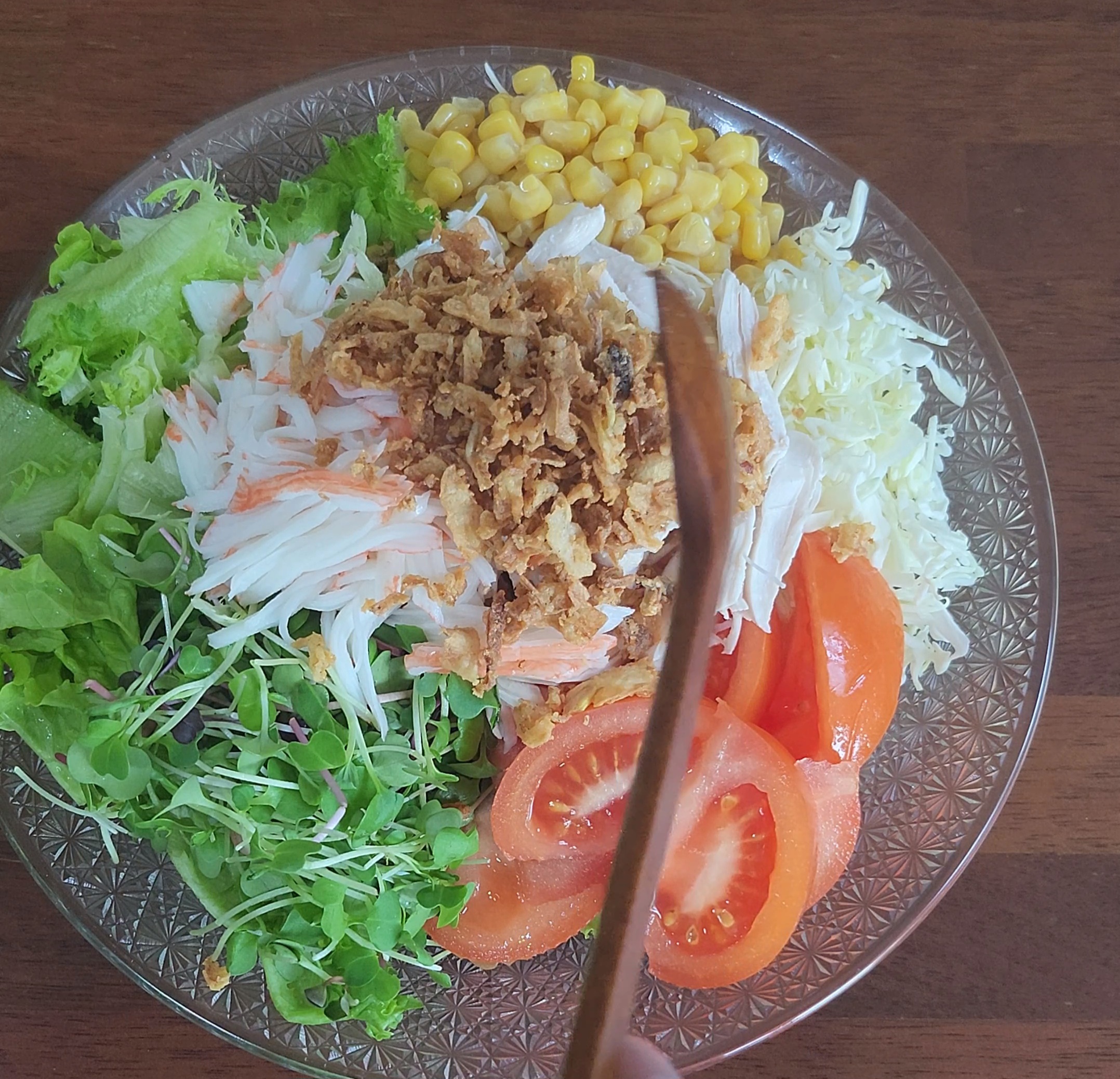 재료: 닭가슴살1개, 오트밀밥반공기, 양배추조금, 샐러드채소, 토마토1개, 옥수수캔1/2, 크래미3개, 양파후레이크3T