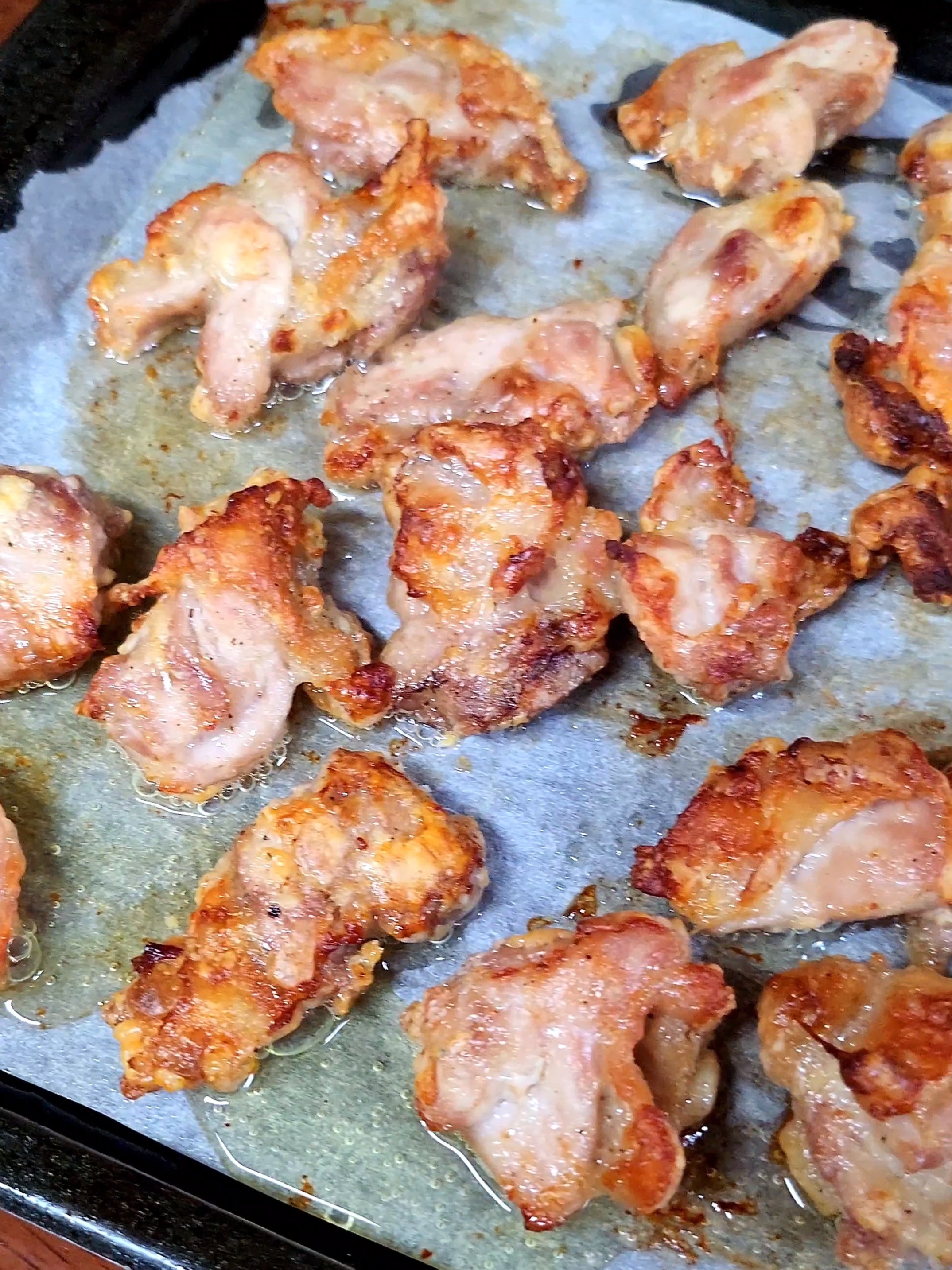 5. 오븐팬에 기름종이를 깔고 오일을 조금 발라주고 닭을 올려주세요